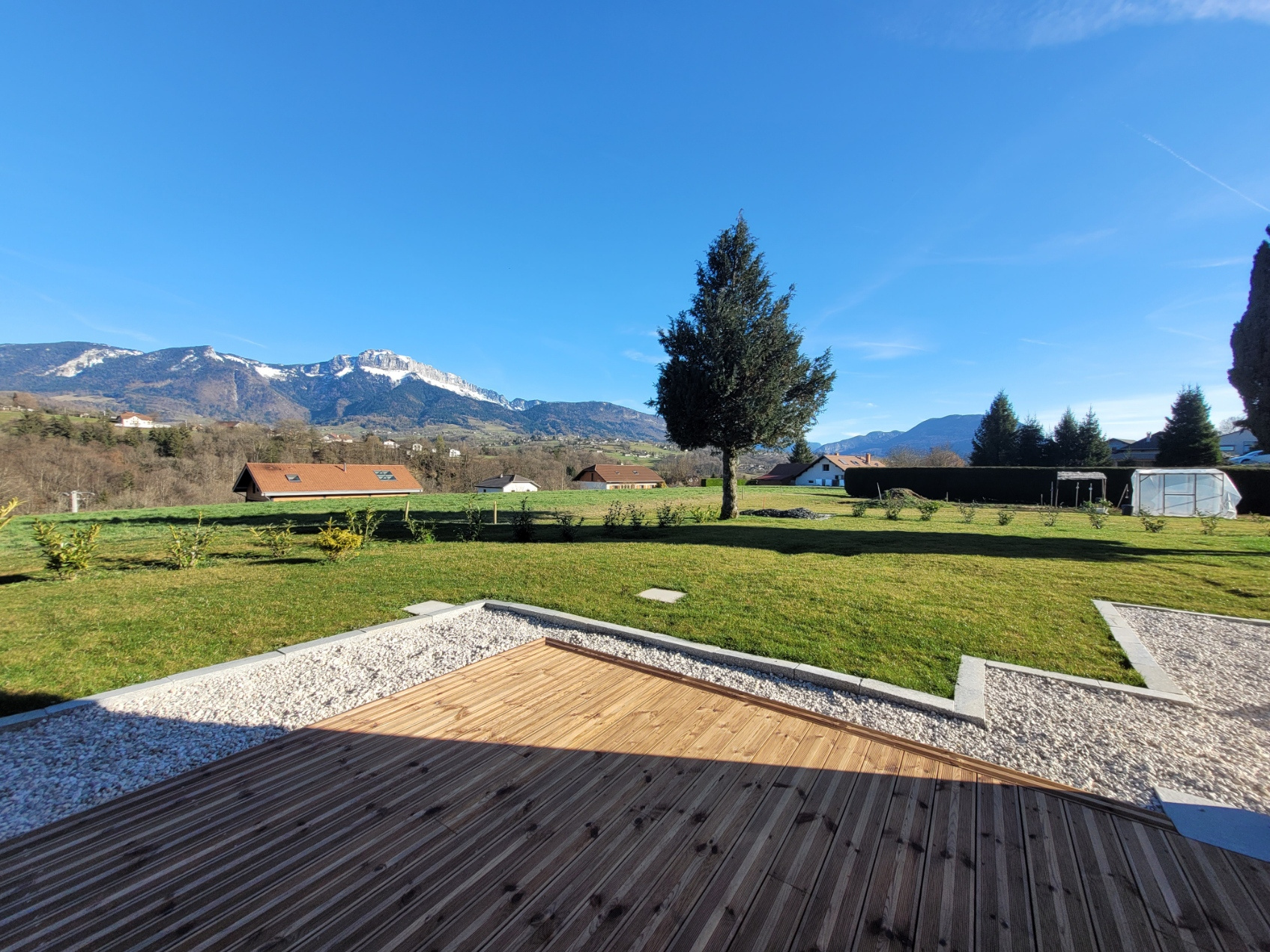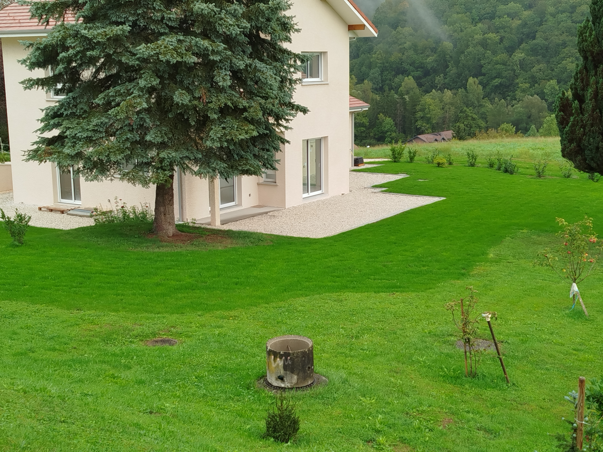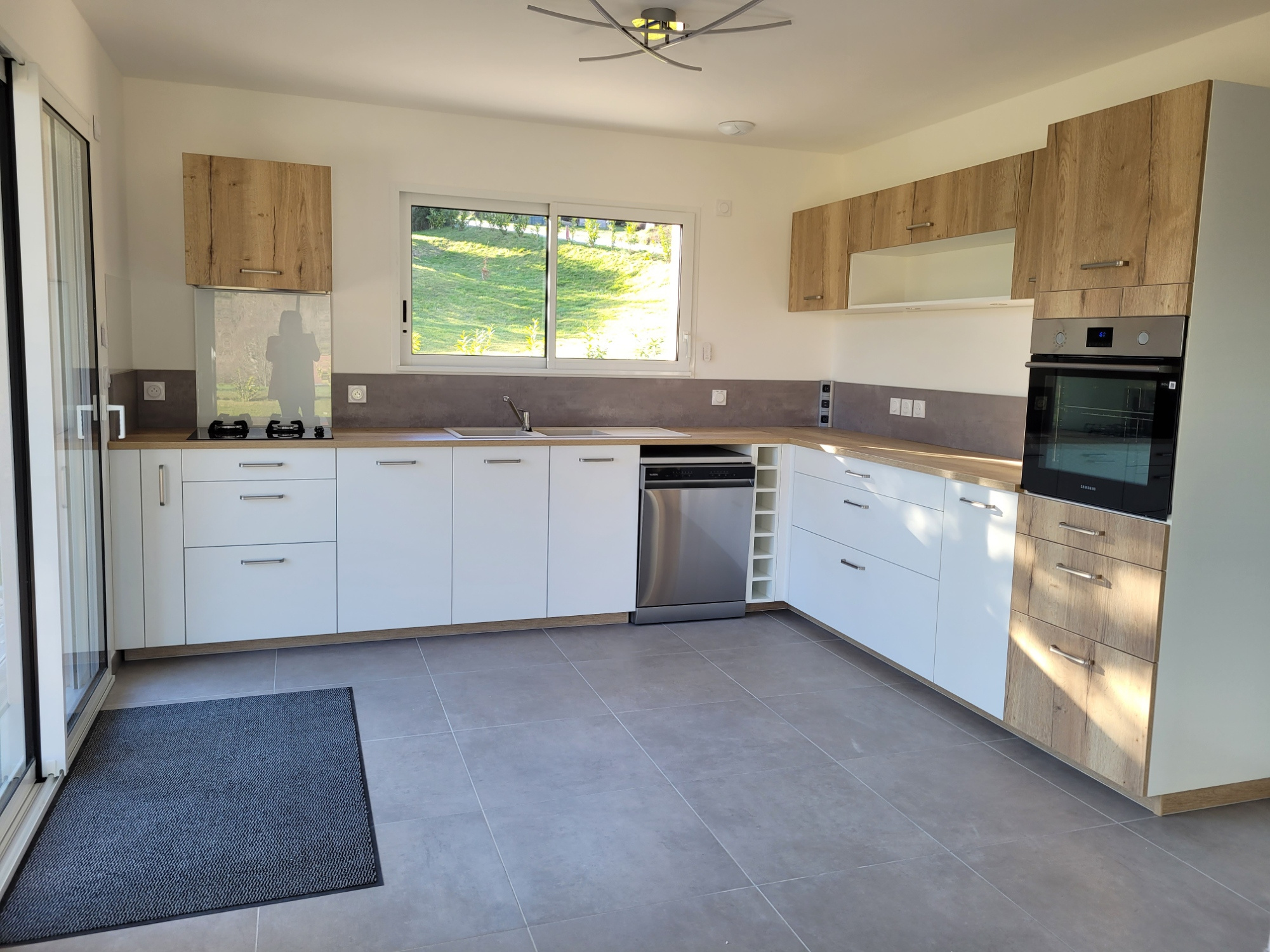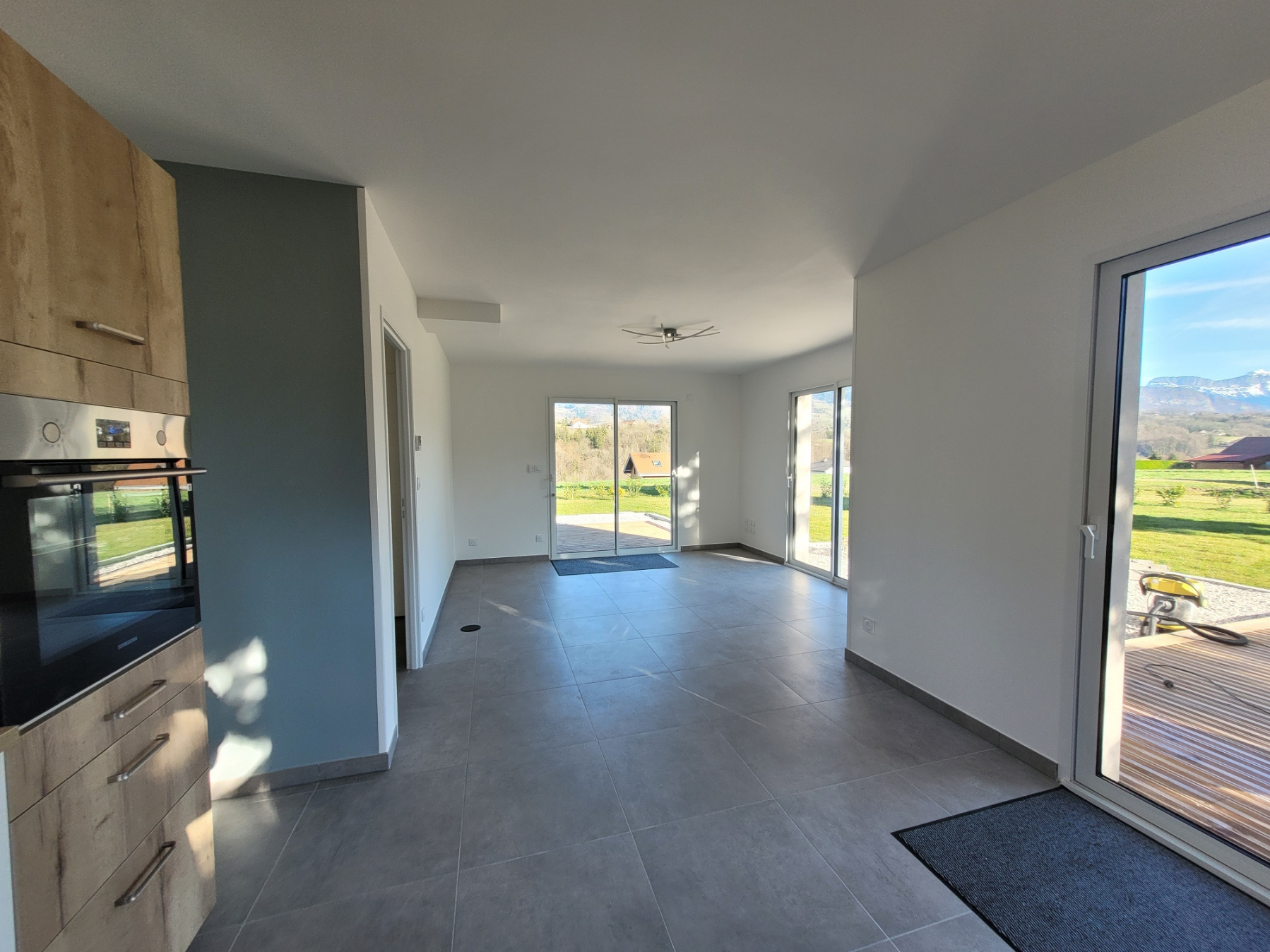 À Saint Martin bellevue coté mercier, belle maison neuve d'environ 113 m2 sur un terrain ensoleillée de 900 m2 comprenant au rez une entrée avec rangements, un salon avec cuisine équipée ouvert sur le jardin - une chambre aavec rangements - une salle de douche avec WC.