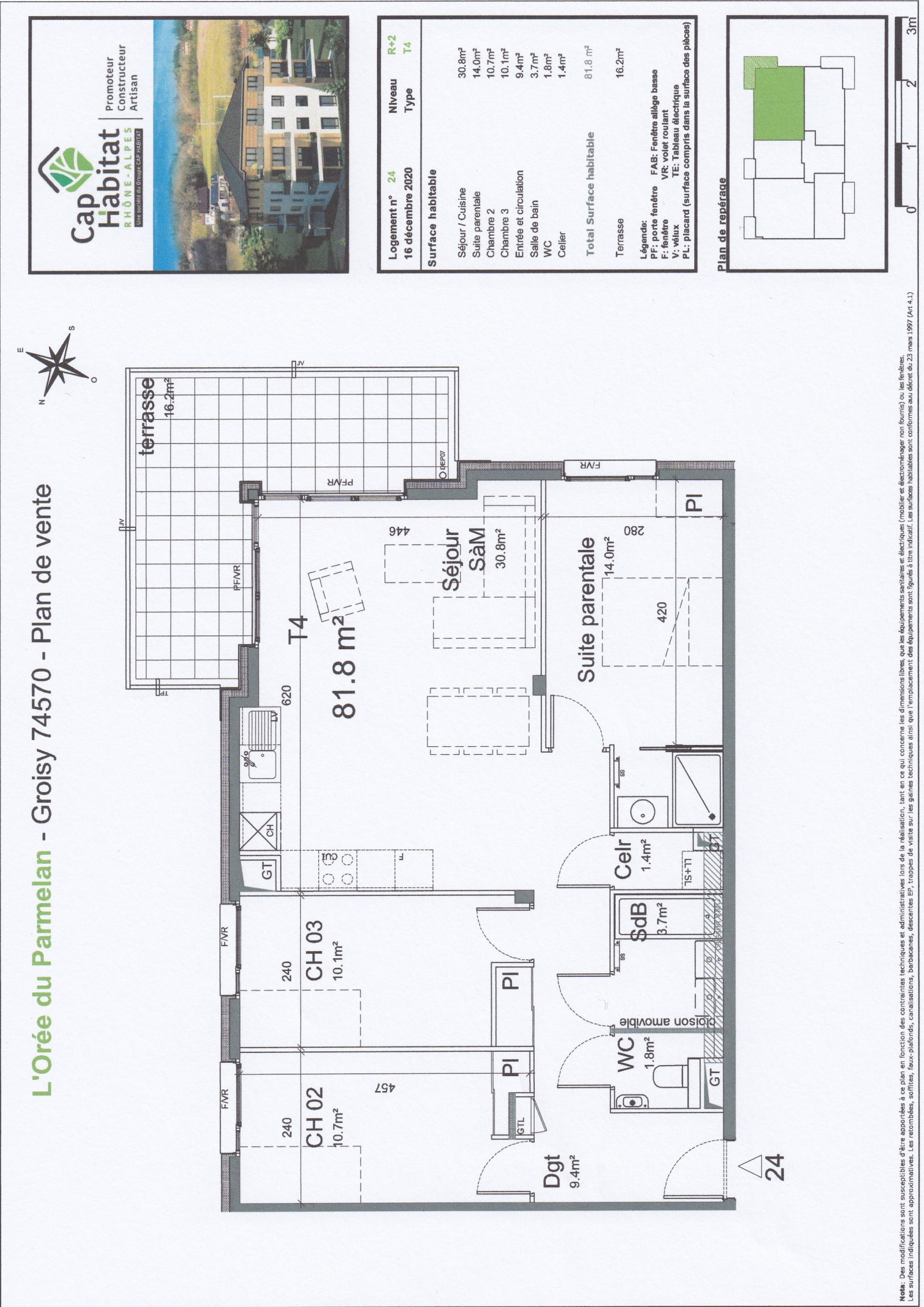 Annonce immobilière pour un appartement disposant de 3 chambres et d'une large terrasse profonde et ensoleillée dans la commune de Groisy. Le bâtiment respecte les normes d'accessibilité. L'appartement se trouve au 2ème étage dans un bâtiment de 3 niveaux ; la copropriété a un ascenseur. Pour organiser une visite de ce bien, vous pouvez contacter votre agence immobilière Burnier Immobilier. Bon choix pour une famille de taille moyenne. L'intérieur comprend un espace nuit comprenant 3 chambres, un coin salon de 30m² et un espace cuisine. La surface plancher intérieure habitable mesure 81.8m² selon la loi Carrez. Pour le bien-être de la famille, ses salle de bains et douche séparée offrent un complément d'intimité appréciable. L'habitation s'accompagne d'un espace de stockage à la cave. Elle vous fait bénéficier d'une alarme assurant la sécurité. Pour vous aérer sans quitter votre appartement, vous bénéficierez d'une terrasse occupant une surface de 16m², ce qui amène la superficie exploitable à 97.8m². Le prix de vente est fixé à 351 740 €.